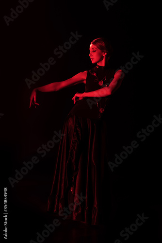 red lighting on flamenco dancer in dress dancing isolated on black
