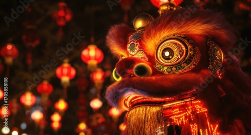 lion, dance, head, red, lantern, chinese, new, year, festival, tradition, culture, celebration, mask, costume, performance, asian, oriental, folklore, mythical, beast, vibrant, glowing, illuminated, night, dark, festive, decorative, fur, detail, eye, gold, ornament, bright, ornate, intricate, traditional, asia, holiday, happiness, prosperity, lucky, wealth, fortune, entertainment, parade, event, background, bokeh