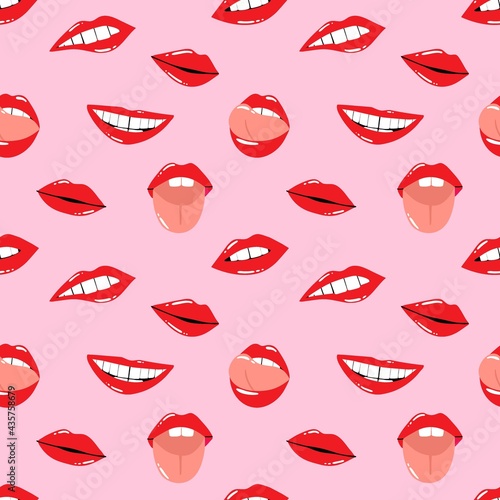 Red lips seamless pattern. Female sexy lipstick. Woman lip with makeup, tongue and white teeth, cartoon vector isolated contemporary decor textile, wrapping paper wallpaper vector print or fabric