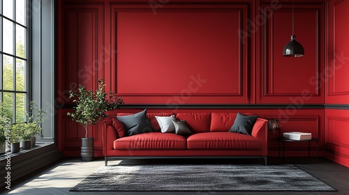 red, live, room, sofa, rug, window, wall, cushion, pillow, interior, loft, bold, paint, floor, quartz, style, wool, couch, french, plant, bright, end, frame, pot, view, vase, bowl, bed, light, tray, seat, tile, sharp, clean, dutch, stone, glasses, throw, sleek, grey, chic, wood, blind, side, desk, silk, art, brick, dine