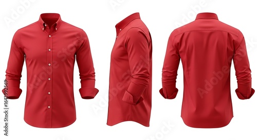 shirt, red shirt, clothing, apparel, fashion, template, design, blank, isolated, front view, half face, backview, button down shirt, formal, casual attire, style, garment, textile, cotton, fabric, sleeve, collar, buttons, presentation, advertising, branding, outfit, men's fashion, male, dress shirt, uniform, wear, realistic, nobody, studio shot, closeup