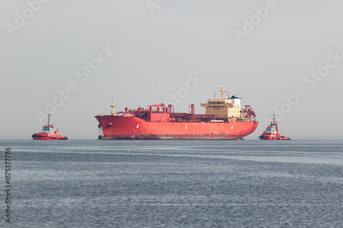Red LPG tanker escorted by tugboats on calm sea waters, maritime transport, industrial shipping, logistics, and port operations concept.