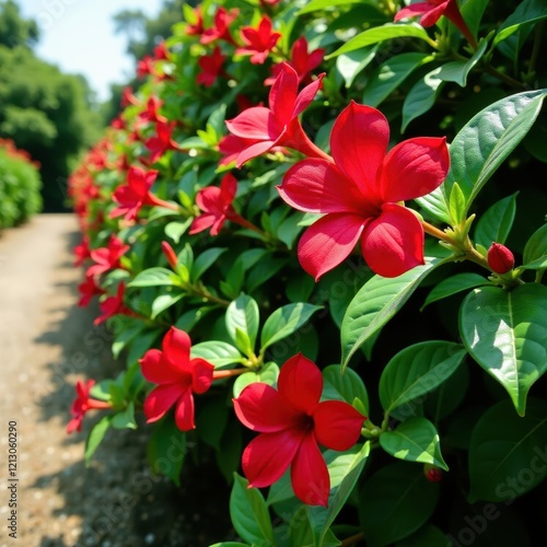 Red mandevilla blooms in a shaded area with lush greenery, ornamental plant, mandevilla flowers, garden scenery