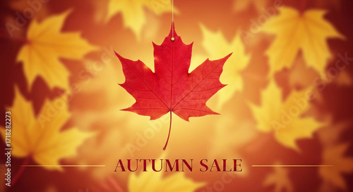Red maple leaf hanging against blurred yellow-orange autumn leaves background, announcing autumn sale, ideal for seasonal promotions and advertisement