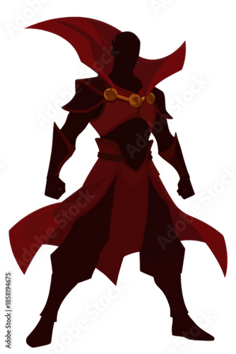 icon, graphic, silhouette, villain, hero, costume, cape, dramatic, fantasy art, minimal, shadow, web design, marketing, presentation, poster, gaming, no people, red color, monochrome