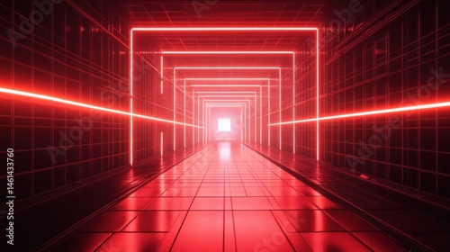 red, neon, light, corridor, tunnel, futuristic, glowing, line, reflective, floor, square, rectangle, bright, dark, abstract, technology, science fiction, space, background, design, digital, art, modern, elegant, graphic, illustration, texture, pattern, vibrant, energy, power, intense, sharp, contrast, depth, perspective, geometry, structure, shape, illumination, glow, beam, ray, shine, effect, atmosphere, ambience