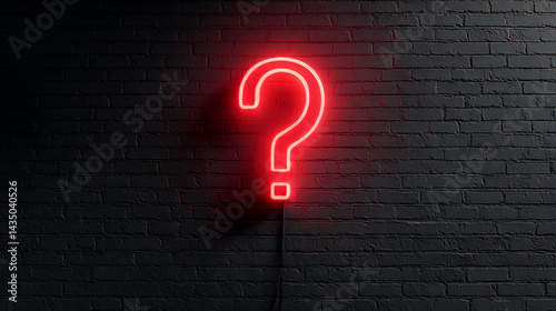 Red neon question mark sign glowing on a dark black brick wall providing a mysterious atmosphere
