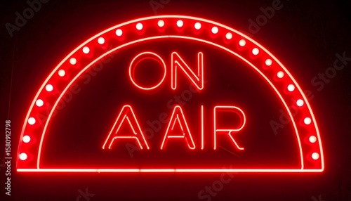 neon, red, light, signs, on, air, radio, broadcasting, display, illuminated, text, message, vintage, retro, graphic, circular, curved, shape, background, dark, black, bright, bold, letter, studio, show, announce, event, communication, technology