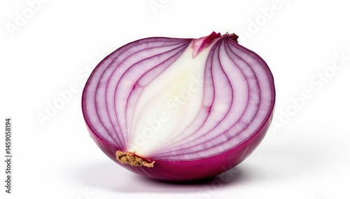Red onion half, cross-section reveals layers, sharp focus, clean white backdrop, food photography, fresh, organic