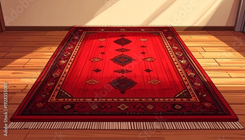 rug, red, oriental, pattern, motif, diamond, floral, geometric, border, fringe, white, floor, wood, texture, wave, lift, shadow, sunlight, natural, hue, design, decor, heritage, tradition, culture