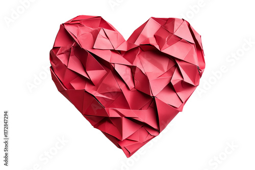 Red origami heart with geometric folds, crafted from paper, isolated on white transparent background. Concept of love and handmade art