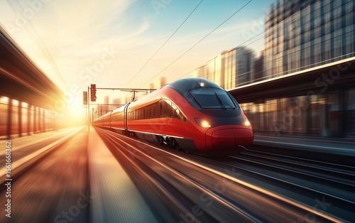 train, railway, transportation, speed, motion, blur, sunset, station, track, city, building, sky, travel, platform, modern, red, vehicle, infrastructure, commute, urban, light, sun, future, technology, power, energy, design, structure, steel, railroad, express, fast, arrival, departure, destination, journey, rush, hours