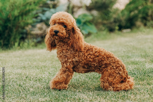 Red poodle sits on the grass in the park for a walk. Walk with your favorite poodle in the park in autumn.