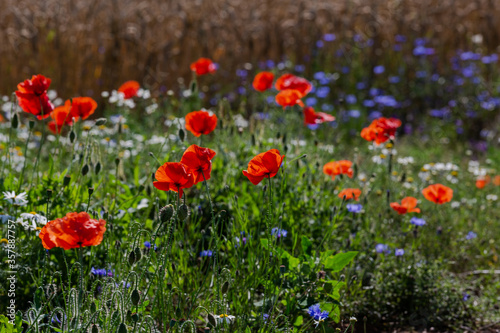 Red poppies in the open air, with blue, green and white backgrounds. with daisies, cornflowers.