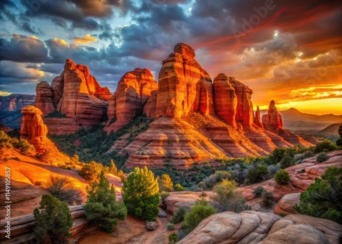 Red Rocks Sunrise Photography: Vintage Arizona Landscape, Scenic Vista, National Park, Canyon, Sunrise Scenery, Majestic Rock Formations