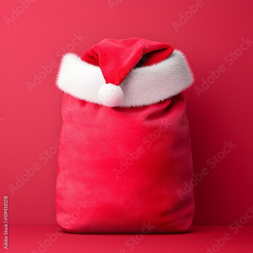 Red Santa Hat on Christmas Bag against Pink Background