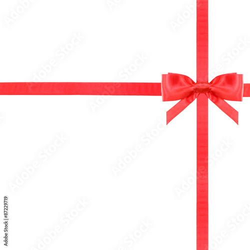 red, bow, ribbon, knot, node, bundle, attaching, tying, disrobed, tape, band, stripes, braid, silk, fabric, textile, isolated, white, white background, present, gift, cardboard box, packing, package, pack, wrapping, banding, taping, box, flat, design, set, intersection, crossing, cross, angle, corner, up high, square, 1, 2, narrow, satin, upper, right