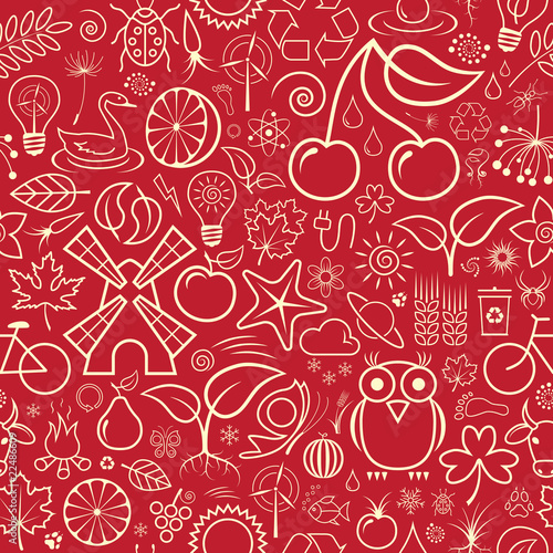 seamless, wallpaper, background, cherry, fruit, food, orange, bulb, nature, mill, windmill, apple, owl, leaf, star, fire, eco, ecology, element, energy, environment, environmental, fish, floral, flower, grass, icon, sun, planet, animal, vector, fashion, abstract, hand, butterfly, tree, water, retro, pattern, ornament, summer, art, repeat, corn, maple, recycling, dripped, snowflake, red