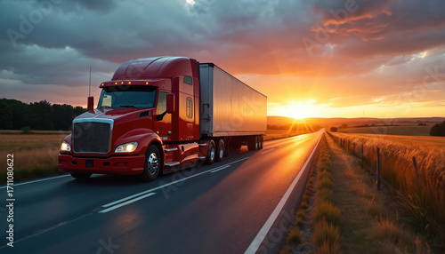 truck, semi, red, road, sunset, driving, transportation, vehicle, highway, country, travel, cargo, delivery, logistic, freight, trailer, commercial, golden hour, sky, cloud, light, sun, evening, asphalt, rural, landscape, horizon, field, wheat, farm, journey, industry, power, speed, shipping, trucking, america, open road, drive, business, economy, distribution, transport, modern, commerce, fuel, interstate