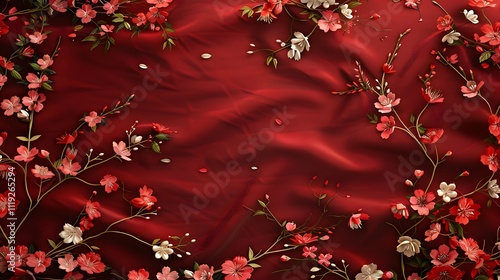 silk, fabric, flower, blossom, cherry, red, background, texture, floral, design, spring, nature, beauty, elegant, delicate, romantic, wallpaper, textile, material, pattern, decoration, art, illustration, image, photo, aesthetic, pretty, shiny, smooth, soft, flower petals, leaf, branch, festive, celebration, holiday, oriental, asian, frame, border, overhead, topview, maroon