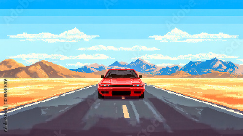 car, driving, road, desert, pixel, art, mountain, landscape, travel, journey, adventure, sky, cloud, sun, sunny, day, highway, transportation, vehicle, automobile, speed, freedom, retro, vintage, video game, 8, bit, digital, illustration, background, scenic, nature, outdoors, nobody, front, view, red, blue, yellow, orange, brown