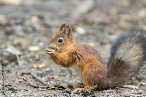 red squirrel standing on the ground in the forest and eating bread