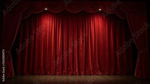 Red stage curtain closed. Spotlight illuminates empty stage.