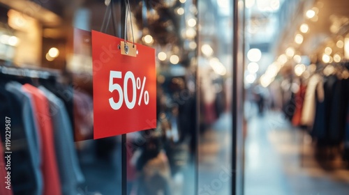 Red tag sale banner with '50 Discount' on a clothing store window, blurred shopping background emphasizing Black Friday deals.