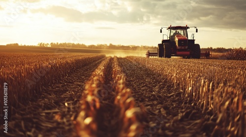 tractor, field, sunset, gold, red, harvesting, agriculture, farm, machinery, rural, landscape, sky, cloud, sun, ray, light, evening, dusk, brown, green, work, dirtied, crop, row, wheel, tire, equipment, farmer, industry, nature, outdoors, summer, fall, season, day, beautiful, scenic