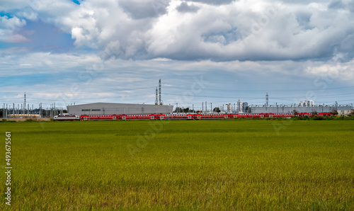 agriculture, background, blue skies, colourful, construction, countryside, environment, estate, field, grass, green, israel, subway, nature, public transport, rail, railroad, railway, red line, rural, sky, speed, station, subway, technically, tel aviv, train, transport, transportation, underground, view, factory, industry, industrial, plant, power, pollution, energy, chimney, building, landscape, smoke, fuel