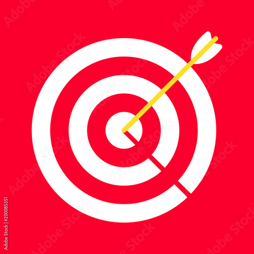 Red white target with arrow in the bullseye with heavy shadow on it. Goal achieving symbol icon sign vector illustration isolated on red background
