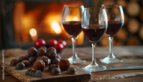 Red wine and chocolate truffles on wooden table against fireplace