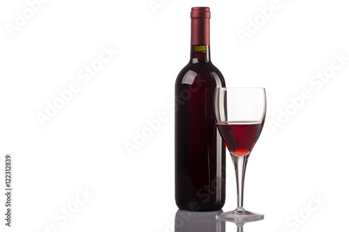 Red wine glass and bottle isolated on white background