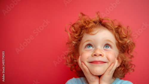 children, boy, background, redhead, studio, red-haired, hair, emotion, portrait, children, toddler, face, head shot, bright, vibrant, colours, colourful, dreamy, thinking, contemplation, imagination, red, ginger, wonder, red hair, freckle, contemporary, red background, wistful, introspective, childlike, girl, reflective, thought, gaze, upward, blue shirt, innocence, childhood, serenity, mulling, peaceful, freckled, reverie, expression, daydreaming
