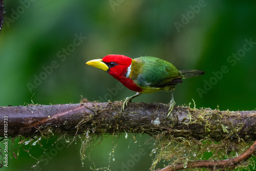Red-headed Barbet sits on the branch in the cloud forest of Ecuador