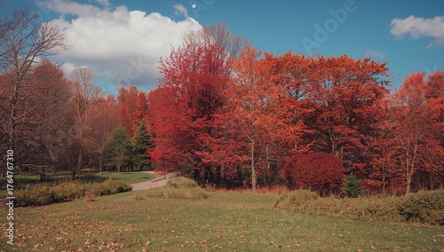 Red-hued fall scenery featuring a park filled with trees and shrubs in a vintage design