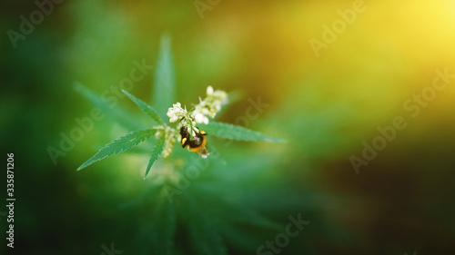 Red-tailed bumblebee on hemp collects pollen from the flowering cannabis, Beautiful background of green cannabis flowers, a place for copy space