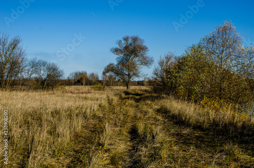ree, field, meadow and forest - blue sky. Lonely tree on an overgrown meadow