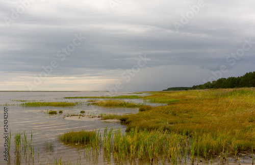 Reed-covered shore of the White Sea. Water, clouds, grass, bushes in the distance.