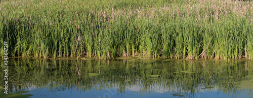 Reeds and tall grass in shallow water. Nature and environmental wetland habitat background