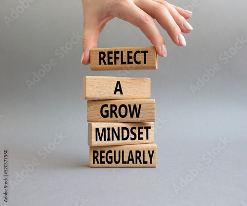 Refclect a grow mindset regularly symbol. Wooden blocks with words Refclect a grow mindset regularly. Businessman hand. Beautiful grey background. Business concept. Copy space.