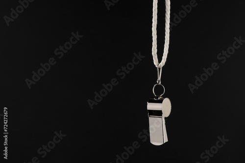 Referee equipment. Metal whistle on black background, closeup and space for text