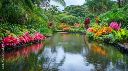 serene, quiet, dreamy, ornamental, greenery, lush, relaxing, paradise, peaceful, tranquil, shadow, vibrant, gardening, growth, palm, calm, sunlight, rainforest, plant, exotic, foliage, vegetation, clear, duck pond, botanical, scenic, horticulture, stem, tropical, lakeshore, riverside, leaf, flower, design, branch, decorative, colourful, wetland, beauty, waterside, flora, water, nature, environment, background, fresh, garden