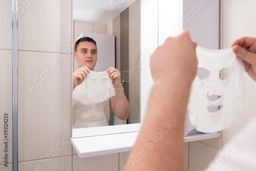 reflection in the mirror man takes care of his face. guy in the bathroom with a face mask