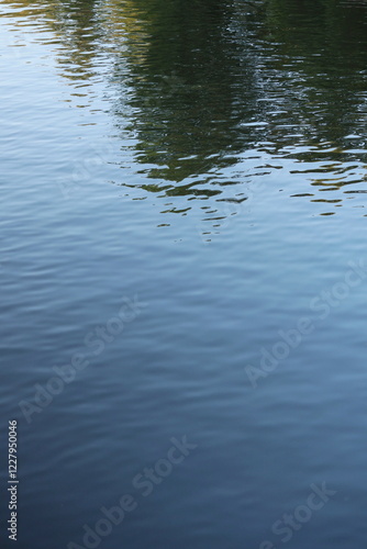 reflection in water, river or lake is blue with reflection of the trees. beautiful in nature. background for screensaver, a place for text