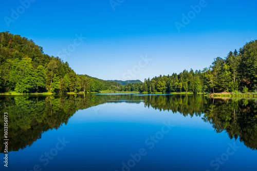 Reflection of forest on Trakoscan lake in Zagorje, Croatia, amazing nature landscape