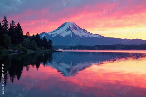 Reflection of Mount Rainier on calm Tacoma Waterfront at dawn, sunrise, peaceful scene, lake