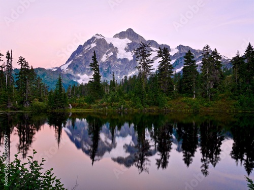 Reflection of mountain in calm water at sunset. Picture Lake and Mount Shuksan at Mount Baker Ski Area. Cascade Mountains near Bellingham, Washington, USA.
