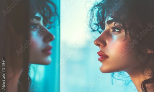 face, woman, girl, mirror, profile, curly, hair, blue, light, skin, shadow, indoor, closeup, beauty, feminine, mysterious, introspection, contemplation, gaze, expression, emotion, serene, thoughtful, window, glasses, subtile, contrast, tone, texture