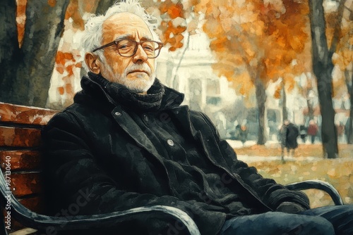 older, man, park, bench, burnout, exhaustion, fatigue, stress, mental, health, contemplation, solitude, loneliness, retirement, senior, citizen, watercolor, painting, artistic, emotional, sleepy, weary, thoughtful, relaxation, nature, serenity, calmness, sombre, contemplative